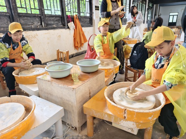 多彩陶艺体验,点亮童趣创意。午餐后,研学团走进陶艺体验基地,开展拉坯、泥塑、彩绘“三项体验”。在专业老师指导下,孩子们挽袖动手,专注拉坯,捏塑出形态各异的小碗小杯;泥塑环节创意在指尖流淌,诞生出一个个童趣小动物;彩绘时用画笔为素坯注入独特色彩。现场欢声笑语不断,家长们也纷纷加入,与孩子一同感受泥土的温度与创造的快乐。
