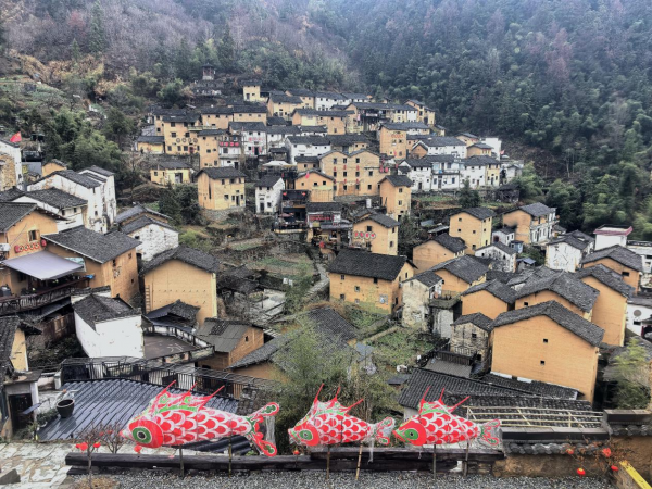 层层叠叠的土楼间,红灯笼与造型灵动的歙县鱼灯交相辉映,村内新春布置错落有致,让古老土楼满是喜庆年味与徽州风情。