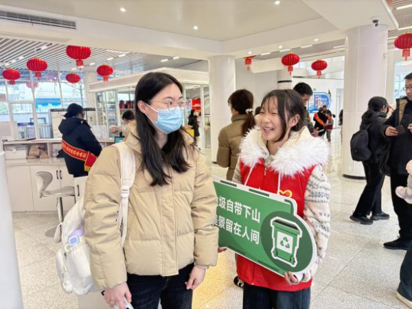 为了让“垃圾不落地、黄山更美丽”的环保理念深入人心,活动特别设置了“垃圾自带下山宣传”互动环节。“红杜鹃”和“红领巾”们向游客免费发放环保垃圾袋,手持“垃圾自带下山 美景留在心间”、“文明游黄山 垃圾不落地”等醒目手牌,进行文明劝导。许多游客被这抹亮眼的“志愿红”所感染,欣然接过垃圾袋,并与可爱的“红领巾”们手持环保手卡合影留念。一张张灿烂的笑脸,不仅定格了旅途中的美好瞬间,更将文明旅游的种子播撒进每个人的心田。
