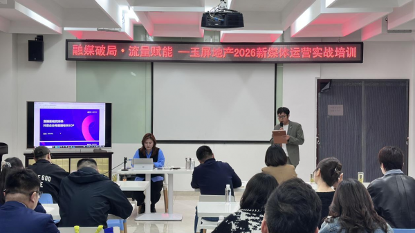 聚力新知,深耕营销。为紧跟新媒体发展趋势,打破传统房产营销固有模式,全面提升全员平台运营、线上直播与短视频实战能力,4月24日下午,玉屏地产特开展深耕新媒・流量赋能——2026新媒体运营专项实战培训。本次培训特邀杭州博采网络科技股份有限公司安徽抖音市场负责人邵敏老师亲临分享,各项目、各案场营销人员齐聚现场,沉浸式投入干货学习,聚力充电,蓄能成长。